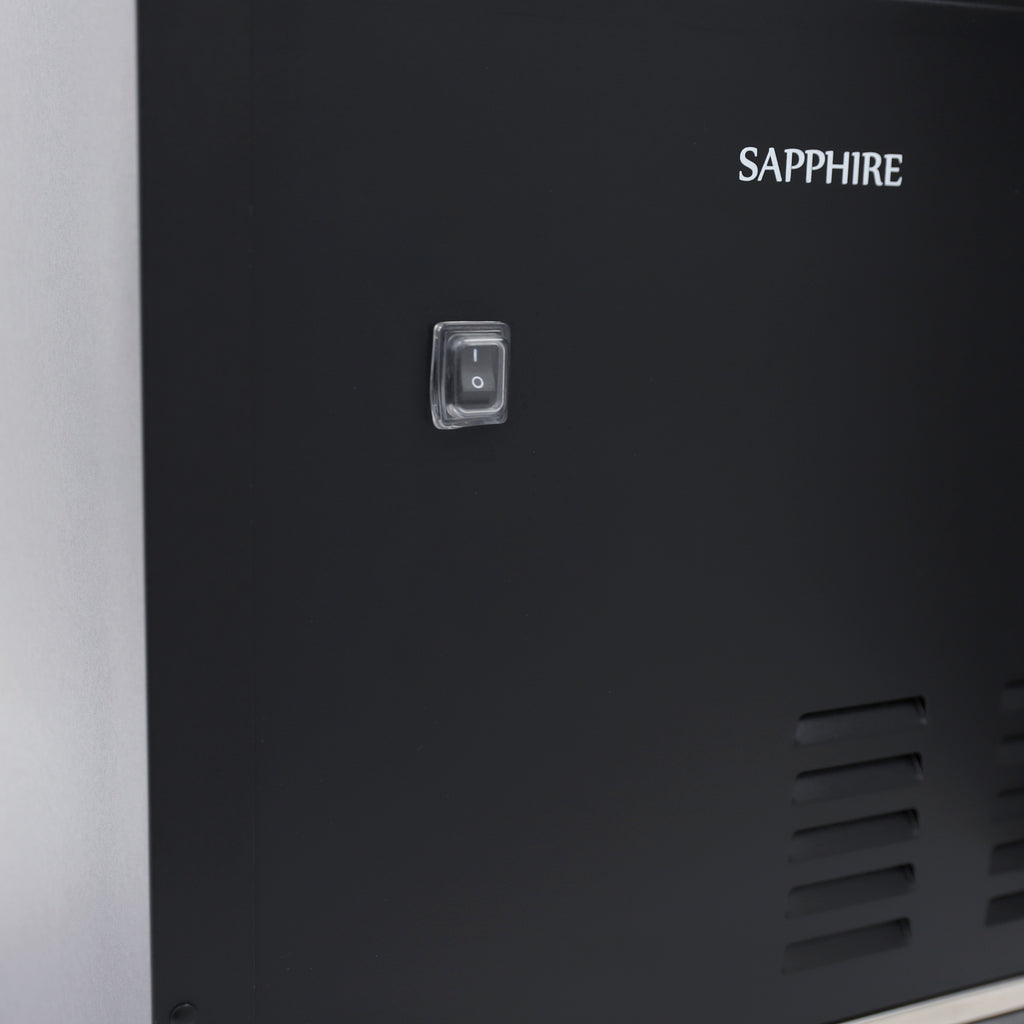Enjoy clean crescent style Sapphire 15" Series 3 countertop Ice Maker. This crescent ice maker up to 25 pounds of crescent style ice cubes per day, and the bin stores 20 lbs. of crescent ice cubes, ensuring you always have the clean ice on hand for entertaining or adding to drinks, cocktails, smoothies and more. The removeable clear ice bin and included ice scoop makes scooping and serving easy. With its matte black prepainted steel exterior and our sleek black interior this ice maker will complement any space in your home inside or out. This stainless steel panel ready model comes equipped with stainless steel panel with stainless steel handle that is easily converted to a 3/4" custom door panel and handle. This crescent ice maker features auto shut-off when the ice bin is full. Designed to install like a cabinet the Sapphire Series 3 crescent ice maker comes with zero clearance pin hinges. The fixed toe-grille design allows for allignment with adjacent cabinetry. Designed with user-friendly on/off toggle controls and an attractive design that will complement your home, the Sapphire Series 3 ice maker provides a steady supply and storage of clean crescent ice cubes. Whether for daily use or entertaining guests, this clear ice maker is a valuable addition to your kitchen inside or out. Covered by the Sapphire Two-Year Parts & On-Site Labor and Five-Year Compressor Parts Only Limited Warranty for installation in residential applications.