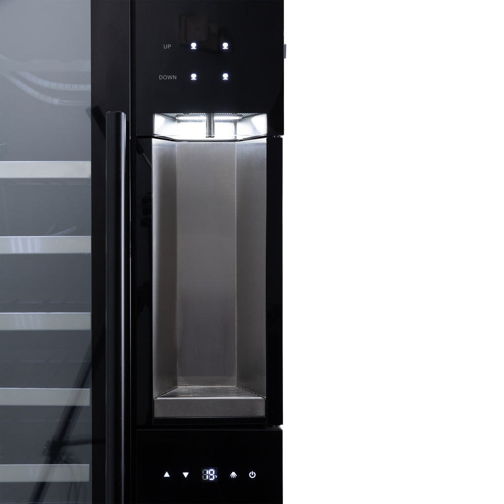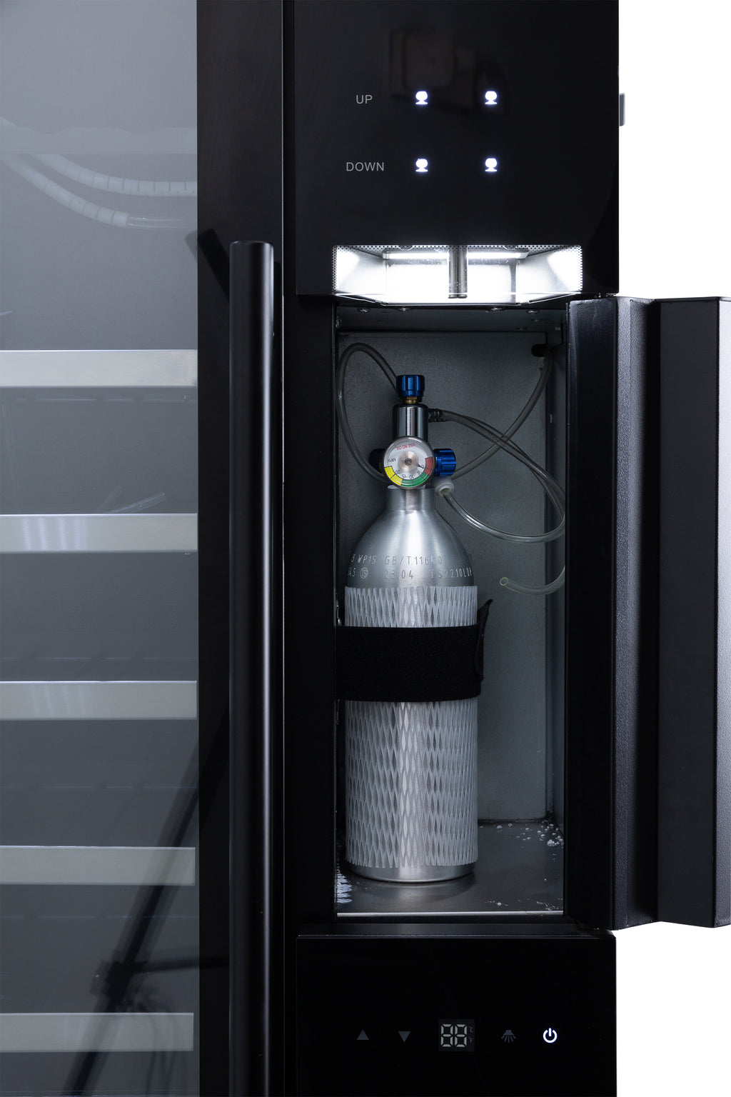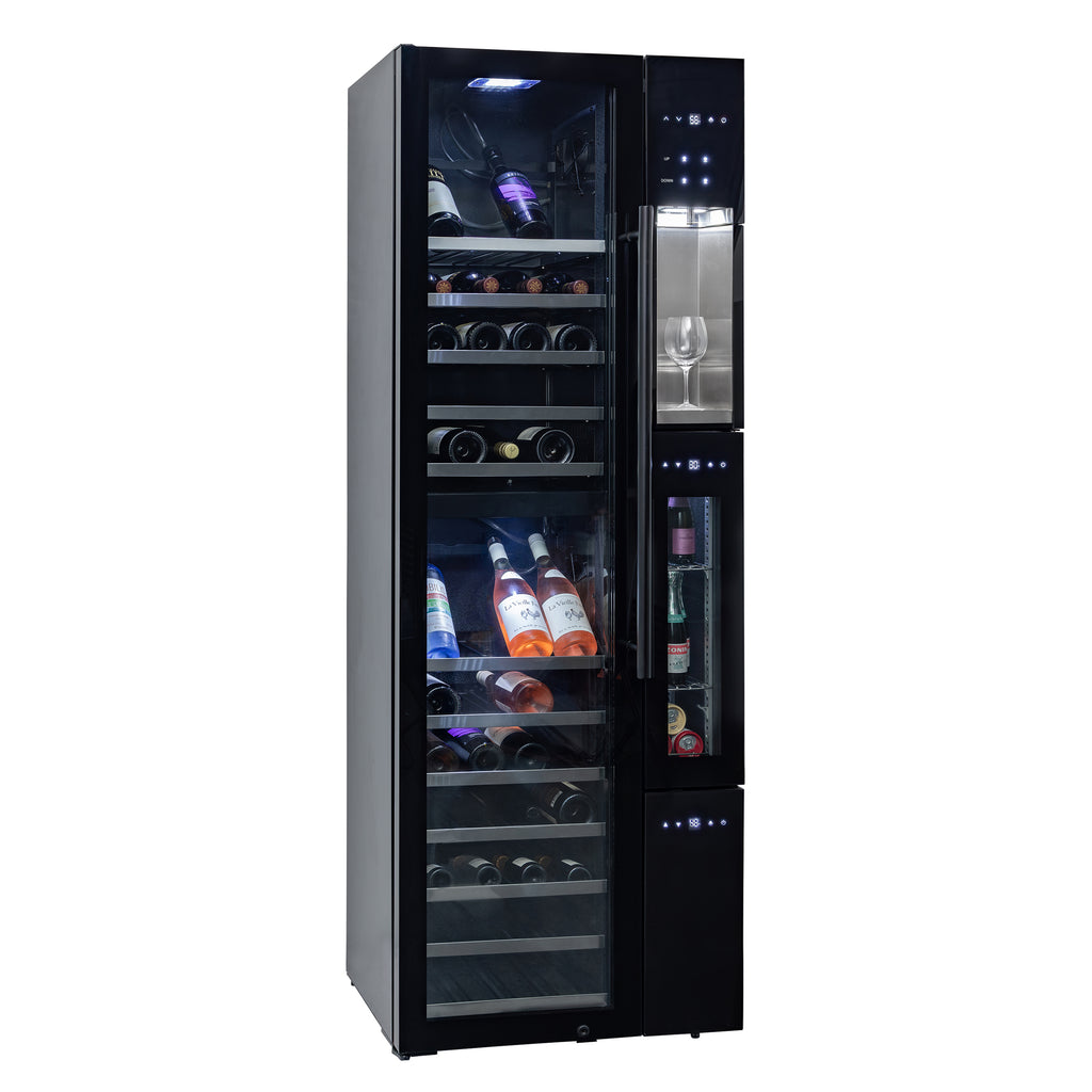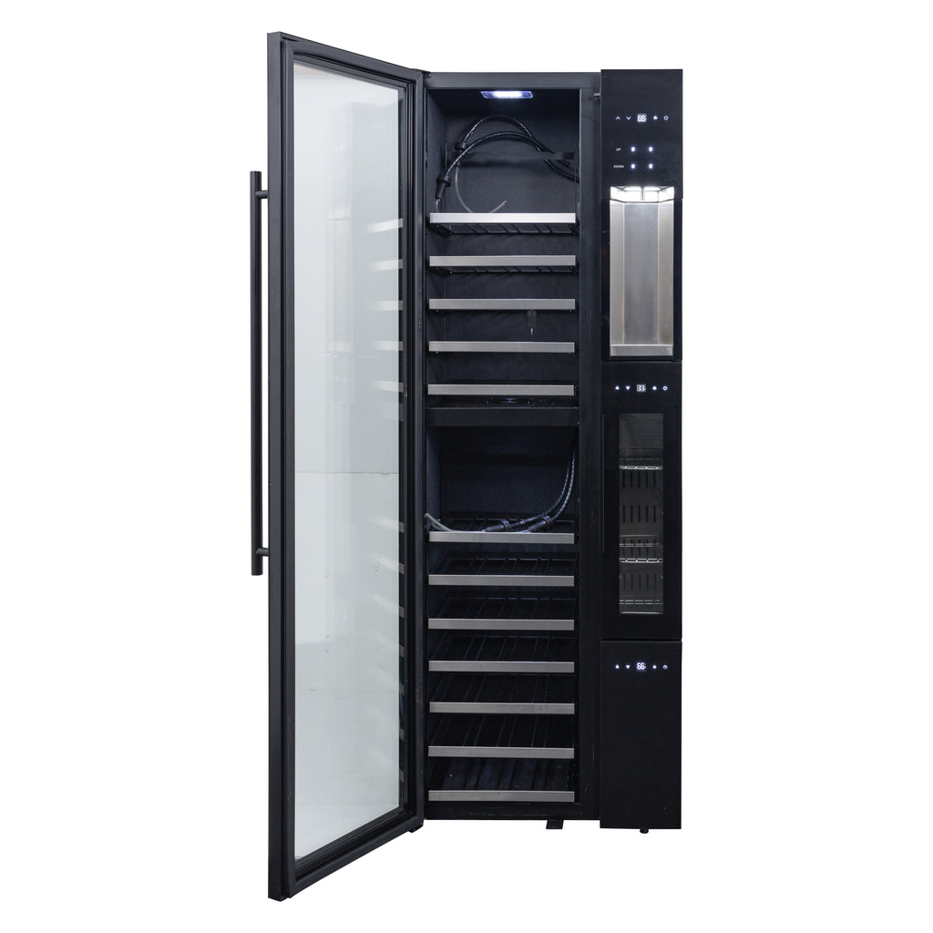 Protect, showcase and dispense your wine collection with the Sapphire Series 3 Triple Zone Wine Tower. Designed for luxury, this wine dispensing tower system offers up to 64 bottles of Wine and 18 Mini Champagne/Sparking Wine bottle storage. Ideal for your kitchen, dining room or entertainment area. Each storage zones offer temperature options from 50° to 65° and a champagne/beverage storage area that is adaptable from 38° to 65° allowing for ideal preservation of any collection. Each wine storage zone can showcase 4 bottles and tap 2 bottles with the integrated dispensing system. The dispensing system is designed to use Argon Gas to preserve open bottles of wine for up to 6 months. Each bottle is tapped with an independent line. The double-paned tempered glass door with UV coating shields your wine from harmful light. This tower system coming in a sleek black glass door with matching designer handle . This triple zone temperature wine fridge will complement any space in your home. This triple zone wine fridge features smooth glide hinges. The easy-to-use electronic control system actively manages your refrigeration system, including lighting. The fan-assisted cooling system allows for even temperatures, quicker cooldown times and added efficiency. LED lighting can be set to display your collection for 4 or 6 hours. The adaptable racking system includes 10 stainless front, wine racks with 2 display racks. Experience the perfect fit for your home wine collection with the Sapphire Series 3 Triple Zone Wine Cooler. Covered by the Sapphire Two-Year Parts & On-Site Labor and Five-Year Compressor Parts Only Limited Warranty.