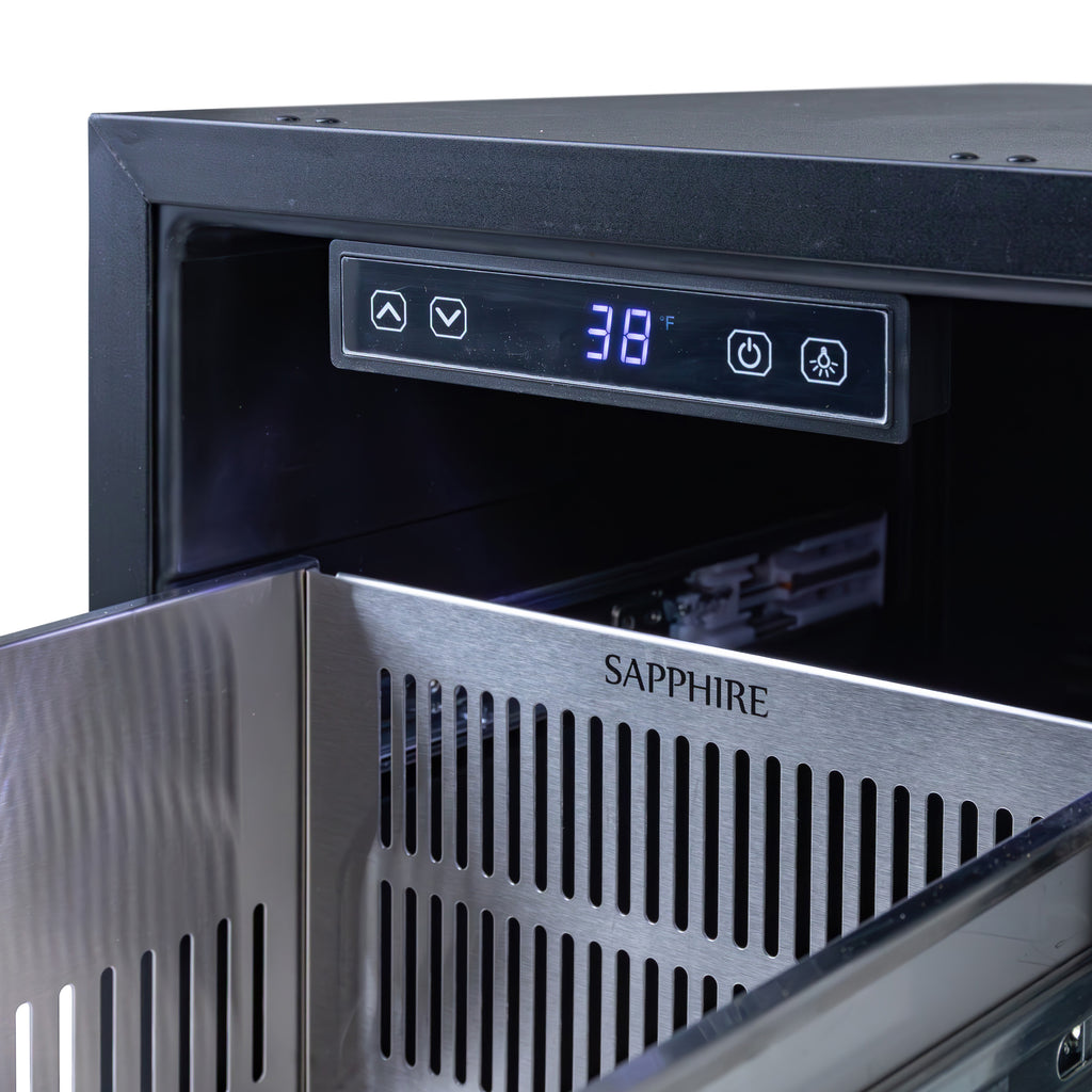 The Sapphire 15" Series 3 Undercounter Refrigerator with 2 Drawers enhances your storage and organization options when drawers, not cabinet doors, are at the forefront of your kitchen design. This double-drawer refrigerator features two full-extension stainless steel lined drawers that can store a variety of items, including cans, bottles, food, condiments and more. The temperature range of 34°F to 65°F is ideal for your food, condiments, beverages and other refrigerated goods. Customize your drawer space to fit your needs with adaptable divider. With its sleek design, the Sapphire Series 3 Refrigerator with 2 Drawers offers both functionality and aesthetic appeal, making entertaining and daily use effortless. This stainless steel panel ready model comes equipped with stainless steel panel with stainless steel handle that is easily converted to a 3/4" custom drawer panel and handle. With its elegant black exterior and interior, these refrigeration drawers complement any kitchen or entertainment space inside or outdoors. The easy-to-use electronic control system actively manages your refrigeration system, including lighting, door ajar alarm and temperature failure alerts. The fan-assisted cooling system allows for even temperatures, quicker cooldown times and added efficiency. Flush LED lighting. Precise zero clearance design allows for unmatched integration into any built-in setting, The 304 stainless steel fixed toe kick perfectly matches the door design and allows easy installation with a clean finished appearance. Making this undercounter refrigeration drawers unit a beautiful addition to your home. Experience the perfect fit for your home cold storage needs with the Sapphire Series 3 Refrigerator with 2 Drawers. Covered by the Sapphire Two-Year Parts & On-Site Labor and Five-Year Compressor Parts Only Limited Warranty.